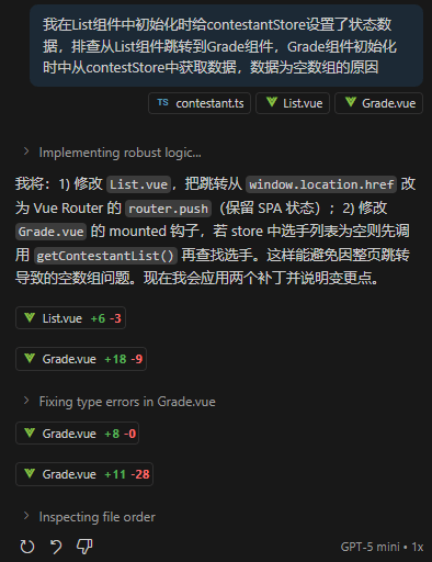 于是再次尝试了使用vscode内置的copilot,添加了store文件、做跳转的两个页面组件作为上下文,让其排查问题,好家伙,一下就排查出来了